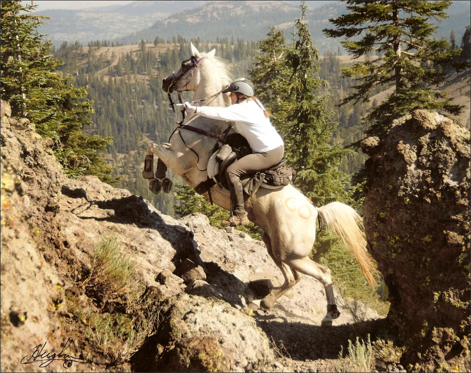 (below) Connie Creech on LS Steele Breeze "Breezy" going up Cougar Rock, on Tevis.
